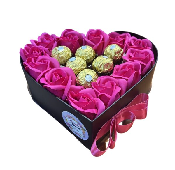 - Lujosa caja corazón con (10) rosas fucsia de jabón aromáticas y 6 Ferrero Rocher. La caja que abarca las Rosas son de elegantes terminaciones de color negro/blanco, sujetada con una hermosa cinta santín fucsia