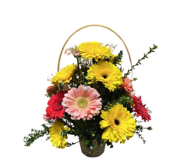 - Sorpréndela con este espectacular canasto de 20 gerberas surtidas. Cada Gerbera va expuesta en un canasto de mimbre, sujetada con una hermosa cinta santín naranja.