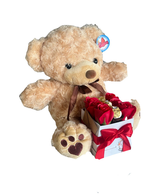 - Cubo de 6 rositas de jabón aromáticas más 3 Bombones Ferrero Rocher, el cubo puede ser en tono blanco/negro, va acompañado po un osito de peluche beige, cafe o blanco 45 cm, y un sobre con tarjeta para mensaje.