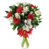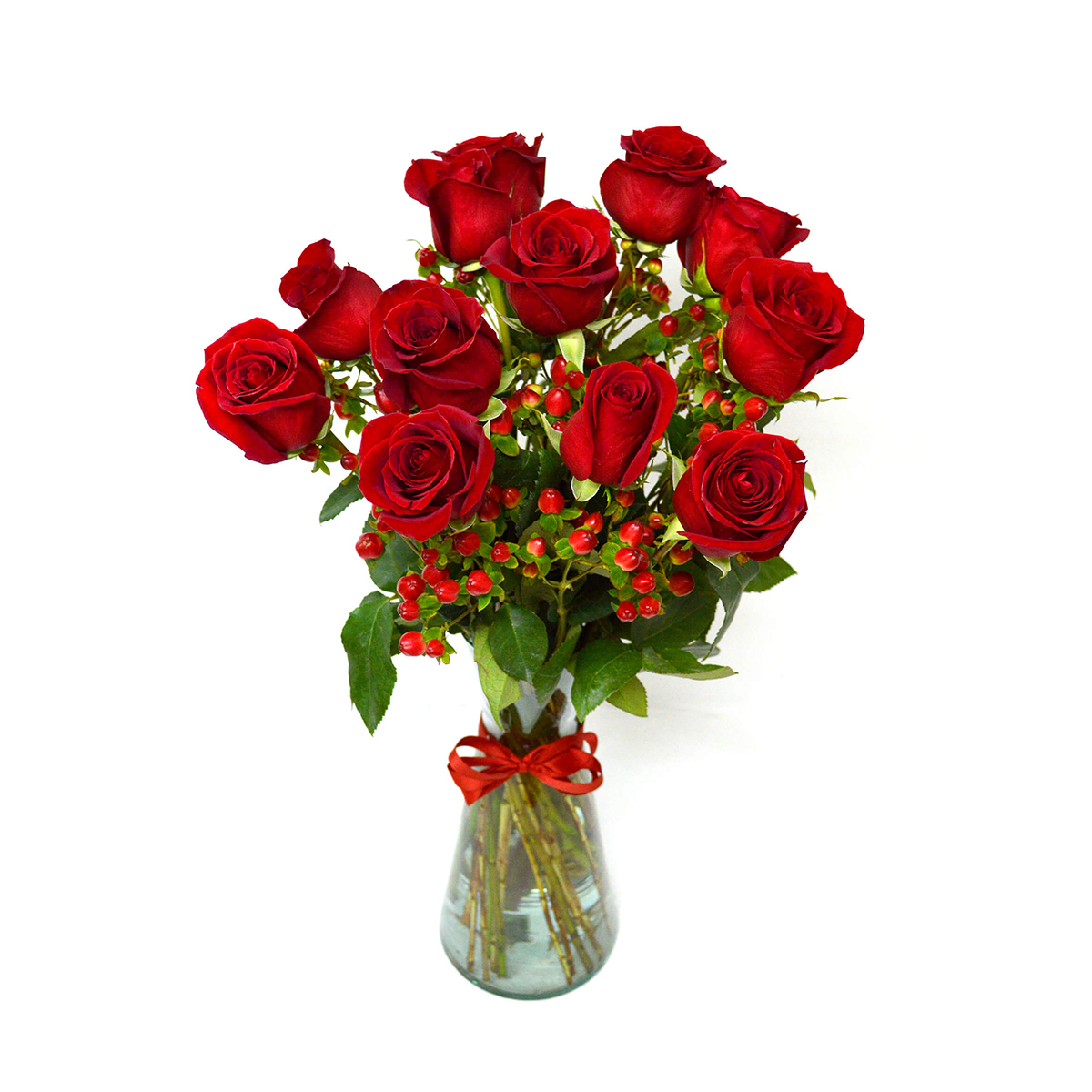 Ipresiona su mirada y hazle pasar un momento inolvidable, con este apasionante Florero de 12 exquisitas Rosas rojas Ecuatorianas de colora elección, acompañadas de 10 hypericum rojo, adornado con una hermosa cinta roja que realza la belleza de este destacado Jarrón.