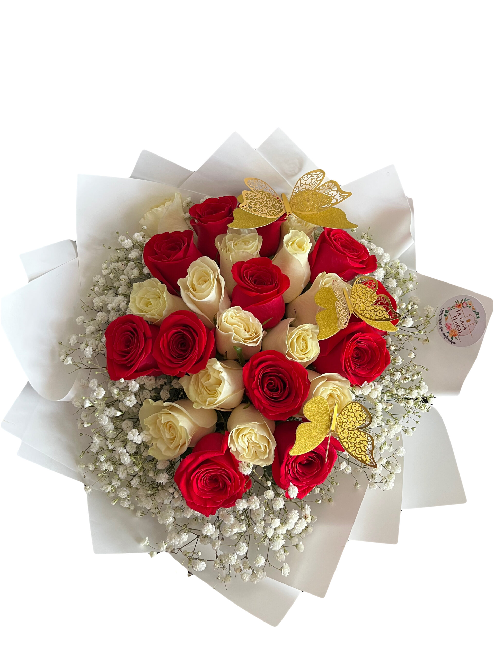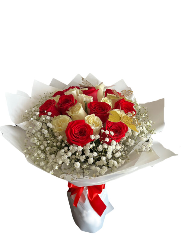 - Soprendente Ramo de 25 hermosas rosas bicolor, van envueltas en un delicado papel blanco amarrado con una linda cinta roja que contrasta perfectamente con las rosas, mariposas decorativas y un sobre con tarjeta para mensaje.