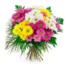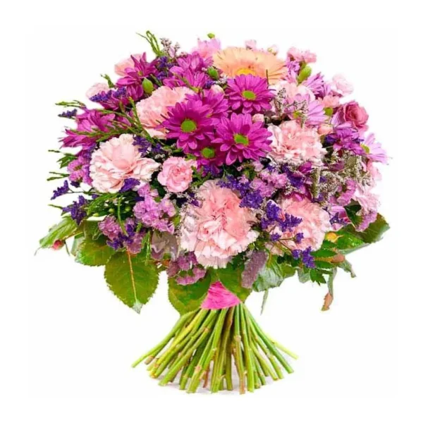 Espectacular ramo de 5 varas de Margaritas Fucsia y 5 varas de claveles Rosado envuelto en papel rosado y cinta satin.