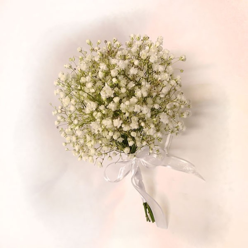 - Ramo de novia redondo confeccionado con elegante Gypsophilia. Envuelto con cinta Satín en el tono rojo y sujetada con un lazo color blanco.