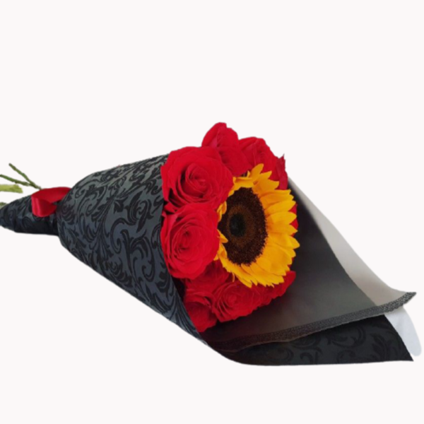 Espectacular ramo compuesto por 9 rosas rojas y 1 girasol.