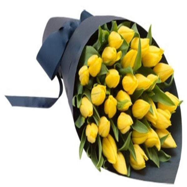 Ramo de 20 hermosos y coloridos Tulipanes amarillos, envueltos en papel negro sujerado con una hermosa cinta color naranjo. Incluye tarjeta para plasmar el mensaje. Impresiana con este dulce opsequio que le encantara. C